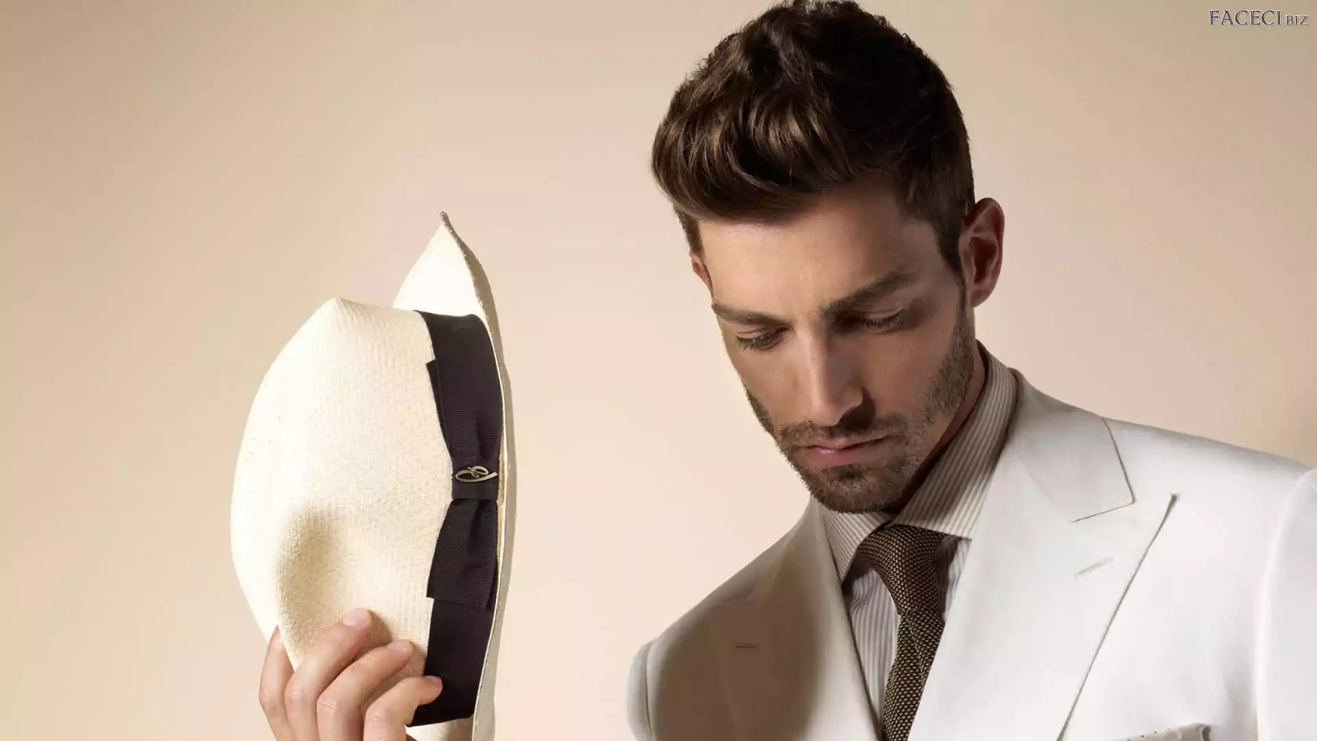 Garnitur, Kapelusz, Brunet, Biały - faceci.biz